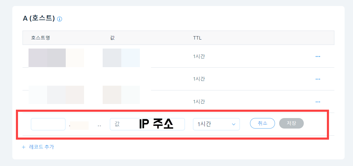 호스트명 필드는 하나는 공백으로 두고 값 필드에 서버 IP 주소를 입력하고, 다른 하나는 호스트명 필드에 www를 입력하고 값 필드에는 마찬가지로 서버 IP 주소를 입력합니다.