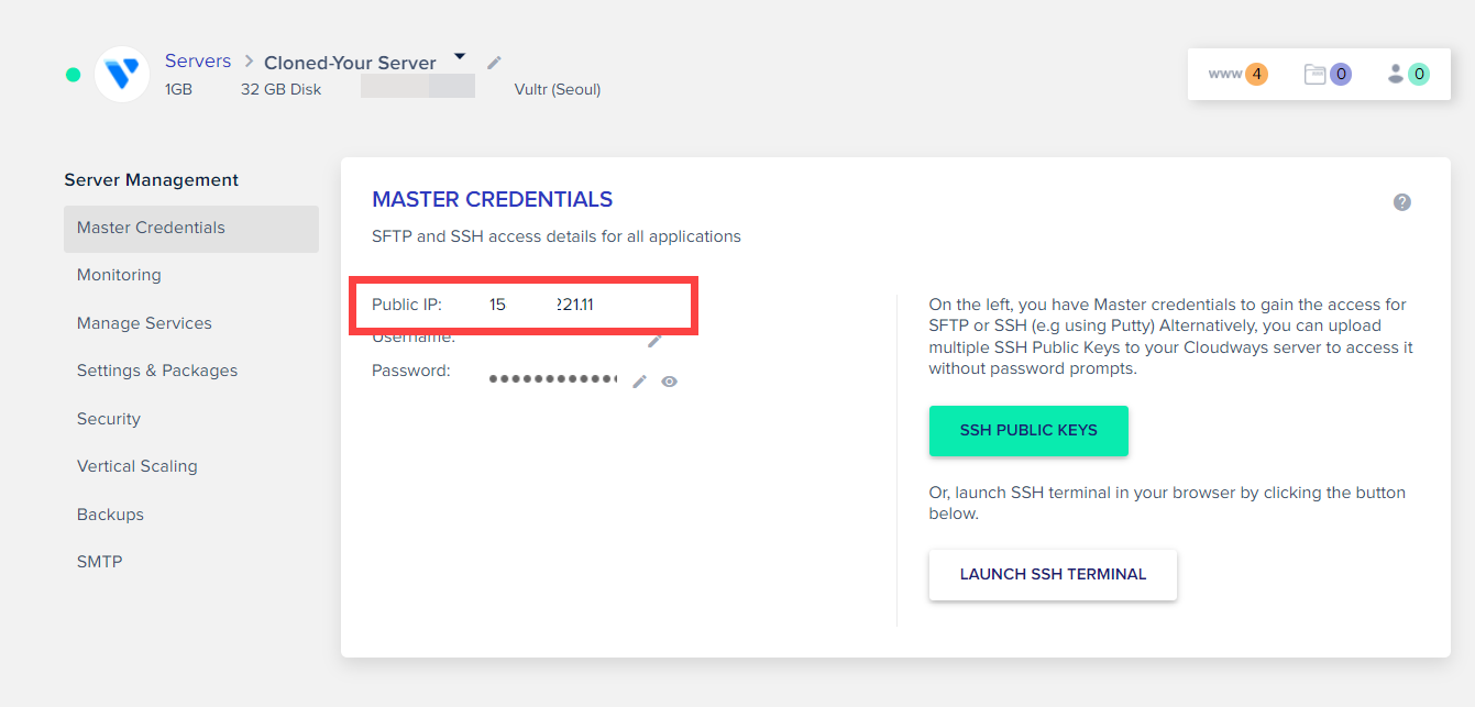 클라우드웨이즈에 로그인한 다음, 해당 서버의 Server Management 페이지에서 Public IP 주소를 기록합니다.