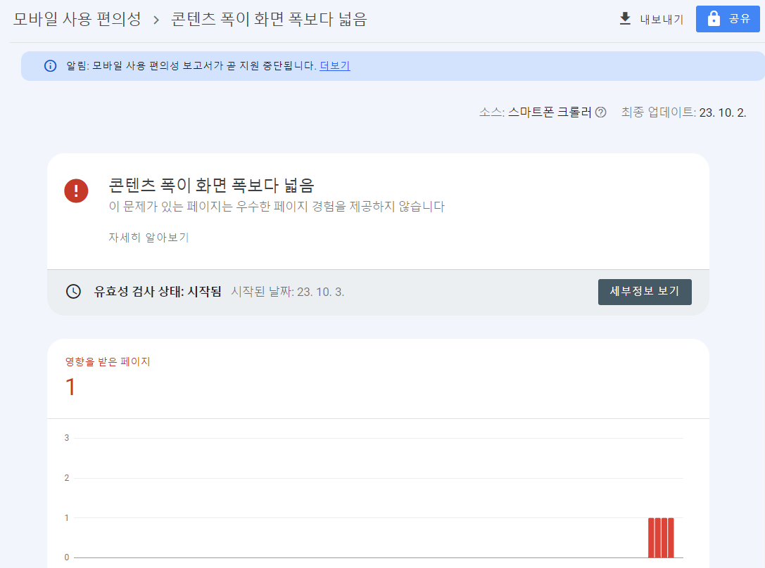 경고 유형과 문제가 되는 페이지 URL을 확인할 수 있습니다. 저는 "모바일 편의성 > 콘텐츠 폭이 화면 폭보다 넓음" 경고가 표시되었습니다. 참고로 모바일 사용 편의성 보고서가 곧 중단된다고 하네요.
