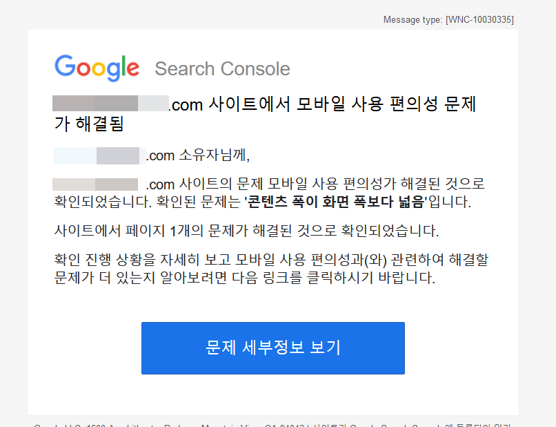 "새로운 모바일 사용 편의성 문제가 감지됨" 경고 메일이 오면 "모바일 사용 편의성 문제 해결하기" 버튼을 클릭하여 해당 페이지로 이동할 수 있습니다.