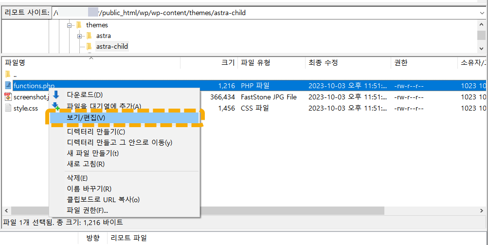 파일질라(FileZilla)를 사용하는 경우 파일을 선택하고 마우스 오른쪽 버튼을 클릭한 다음, 보기/편집 컨텍트 메뉴를 선택합니다.