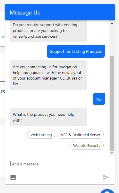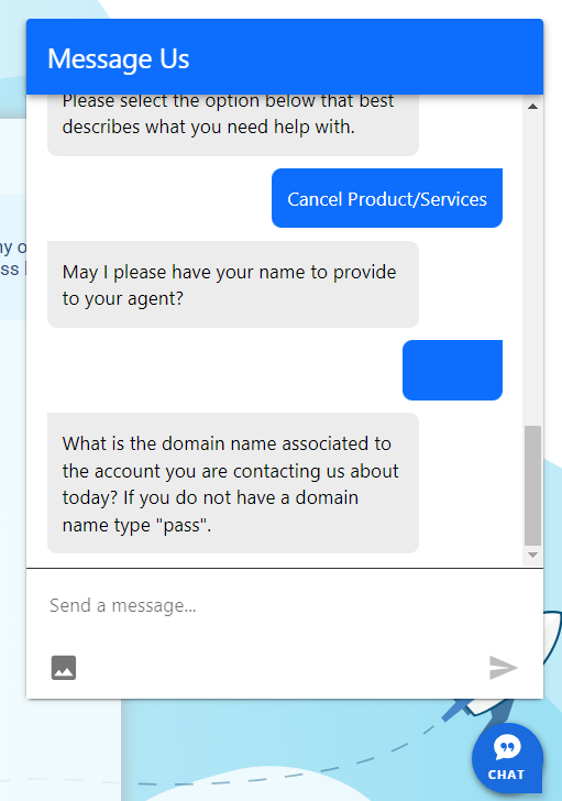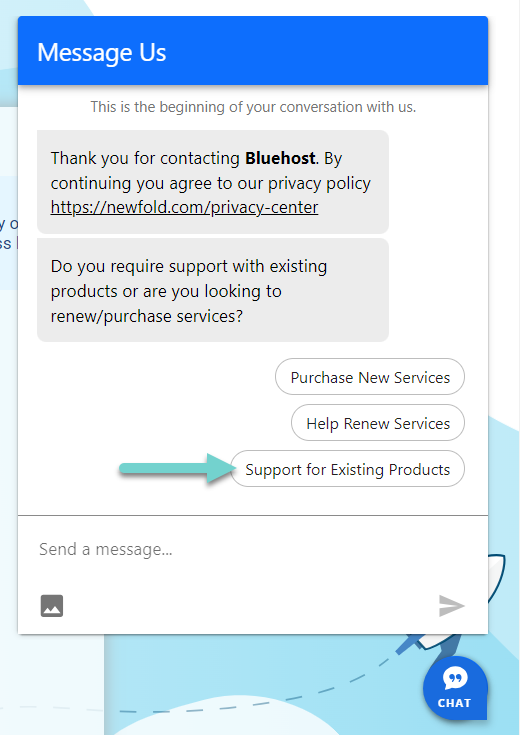 라이브 채팅은 로그인하지 않아도 요청할 수 있습니다. 블루호스트 홈페이지에 접속한 다음, 오른쪽 하단의 채팅 아이콘을 클릭합니다. (실제 채팅 화면은 수시로 변경될 수 있습니다.)