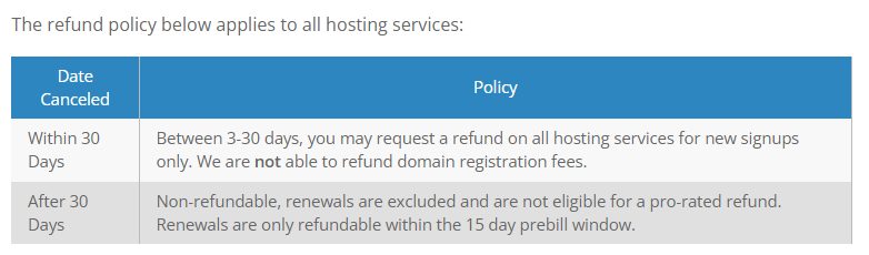 블루호스트에서는 30일 환불 보장을 내걸고 있습니다. 신규 가입 후 30일 이내에는 환불이 가능합니다. Bluehost의 환불 규정은 아래와 같습니다.