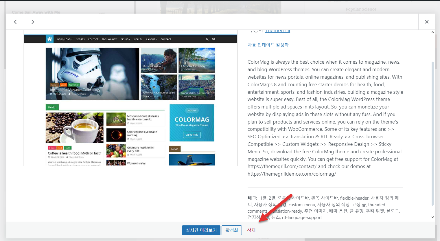 테마 상세 정보 화면이 표시되면 하단의 "삭제"를 클릭합니다.