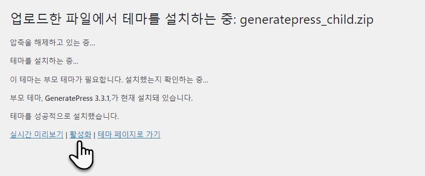 설치가 완료되면 "활성화"를 눌러 차일드 테마를 활성화합니다.