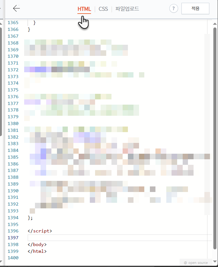 HTML 코드와 자스 코드는 꾸미기 » 스킨 편집으로 이동하여 html 편집 버튼을 클릭하고 HTML 탭에 추가하도록 합니다. [**</body>**] 태그 바로 위에 HTML 코드와 자바스크립트 코드를 입력하면 됩니다.