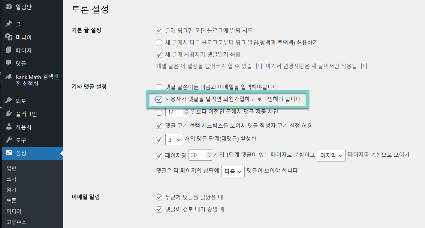 2) 설치형 워드프레스에서 로그인한 사용자만 댓글을 달 수 있도록 설정하면 해당 사이트에서 회원으로 가입한 사용자만 댓글을 달 수 있습니다.*]