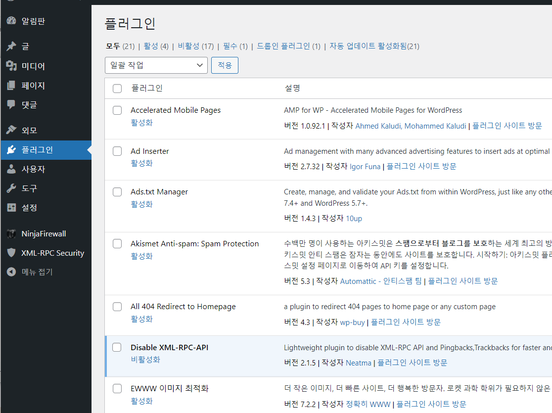 플러그인의 경우 21개가 설치되어 있고, 설치된 플러그인 중에서 선택하여 활성화할 수 있습니다.