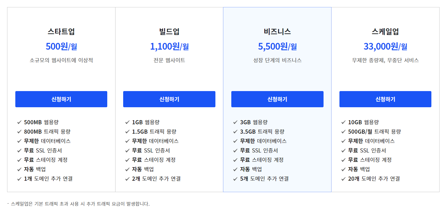 카페24는 블로그를 시작하려는 경우 괜찮은 옵션일 수 있습니다. 카페24에서는 월 500원짜리 상품과 월 1,100원짜리 상품 등 저가형 상품이 있습니다.
