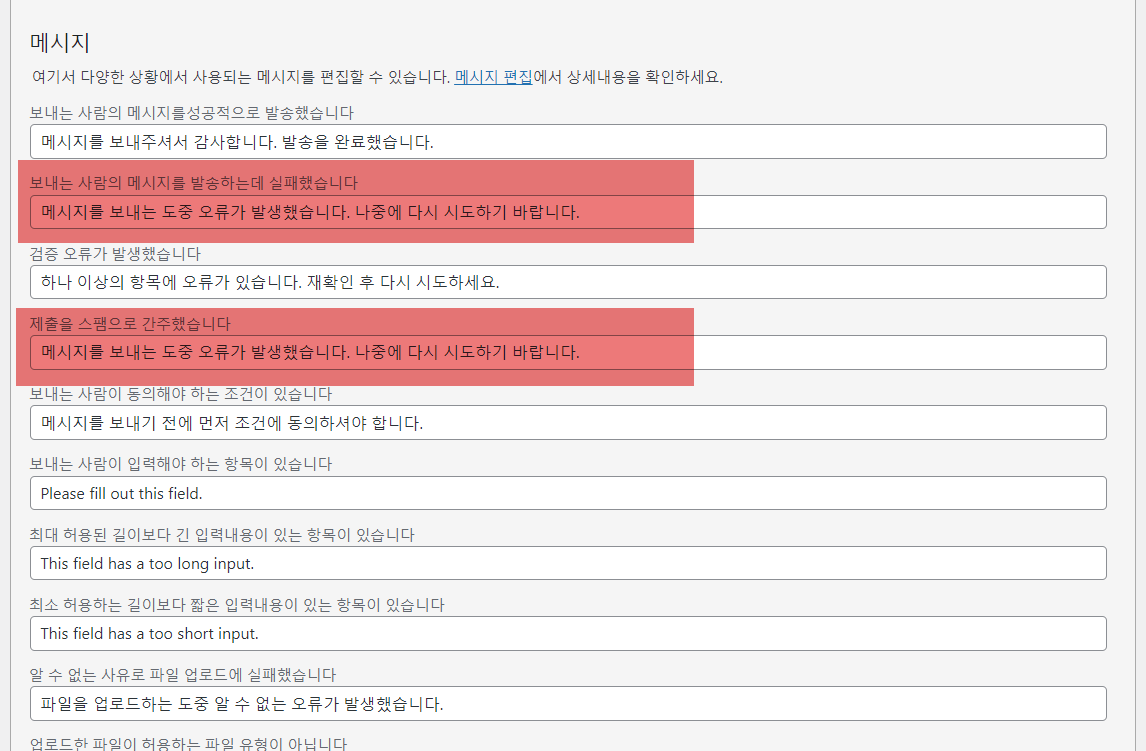 이 오류 메시지 자체만으로는 무엇이 문제인지 알 수가 없습니다. 이 부분에 대해 이해하려면 Contact Form 7의 메시지 부분을 살펴볼 필요가 있습니다.