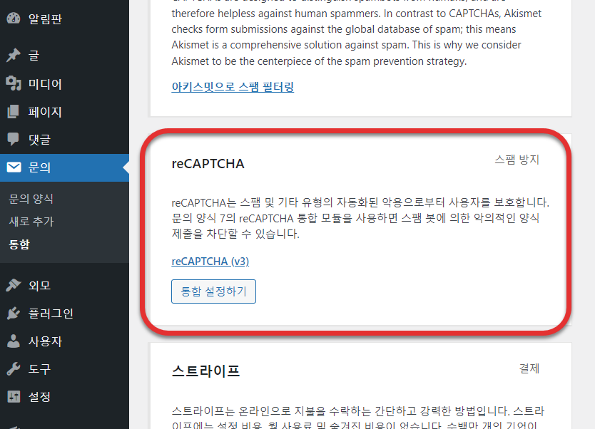 문의 (Contact) » 통합 (Integration)에서 구글 reCAPTCHA가 설정되어 있는지 체크해보시기 바랍니다.