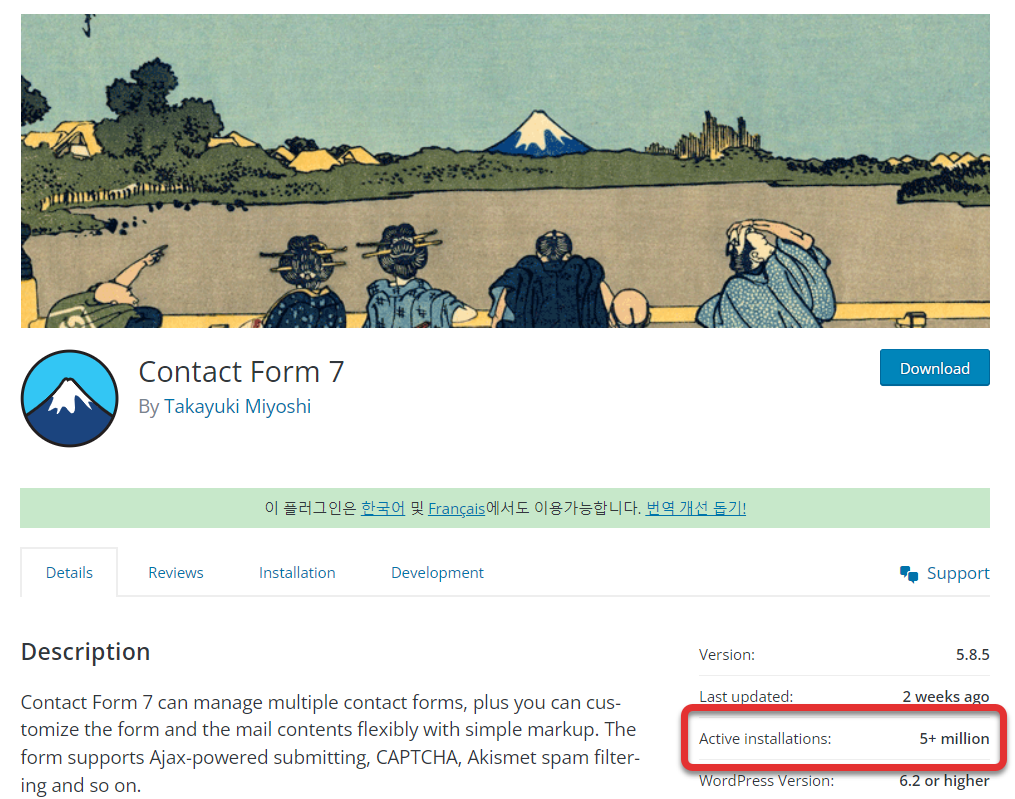 Contact Form 7은 워드프레스에서 무료로 사용할 수 있는 문의 양식 플러그인으로 현재 500만 개가 넘는 사이트에 설치되어 사용되고 있습니다.