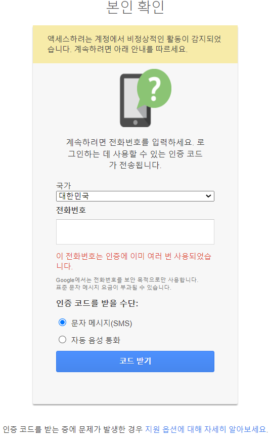 지메일 계정을 하나 더 만들어서 진행할 수 있습니다. 경우에 따라 핸드폰 번호를 통해 인증하도록 요구할 수 있습니다. 여러 개의 지메일 인증에 사용된 핸드폰 번호를 입력하면 "이 번호는 인증에 이미 여러 번 사용되었습니다" 오류가 발생할 수 있습니다. 구글에서 지메일에 대한 본인 인증 절차를 강화하고 있는 것 같습니다.