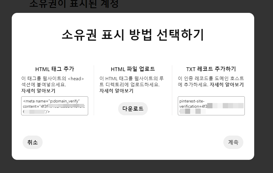 핀터레스트 핀 일괄 만들기 기능을 사용하려면 먼저 사이트 소유권을 확인해야 합니다. 구글 서치 콘솔과 네이버 서치 어드바이저에서 사이트 소유 확인을 하는 절차와 비슷합니다.