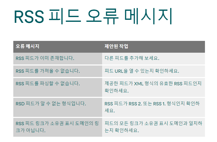 RSS 피드를 파싱할 수 없는 오류에 대하여 제공한 피드가 XML 형식의 유효한 RSS 피드인지 확인하라고 설명하고 있네요.