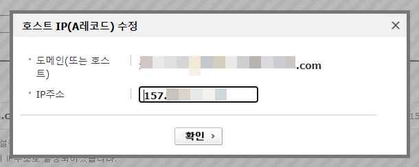 호스트 IP(A레코드) 수정 팝업이 표시되면 IP주소를 입력합니다.