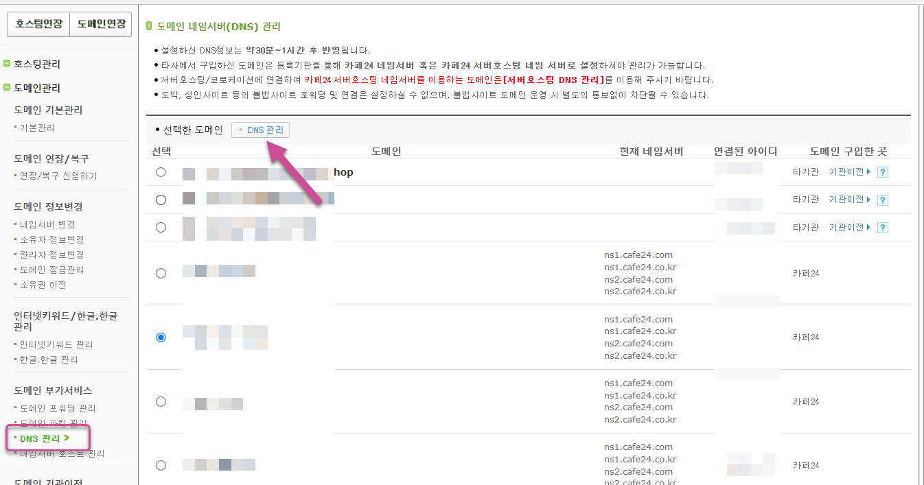 도메인을 카페24에서 등록한 경우 도메인관리 » 도메인 부가서비스 » DNS 관리로 이동하여 해당 도메인을 선택하고 DNS 관리 버튼을 클릭합니다.
