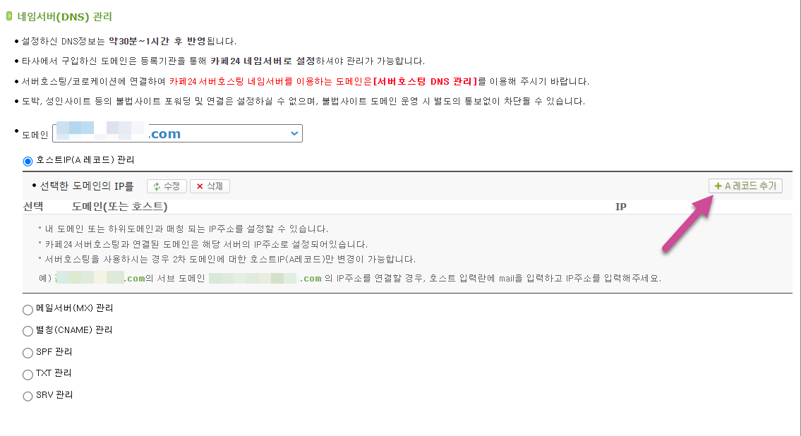 네임서버(DNS) 관리 페이지에서 호스트IP(A 레코드) 관리 항목을 선택하고 A 레코드 추가 버튼을 클릭합니다.