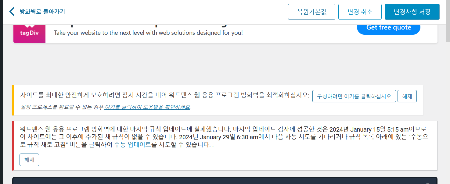 "워드펜스 웹 응용 프로그램 방화벽에 대한 마지막 규칙 업데이트에 실패했습니다" 경고가 표시되는 경우