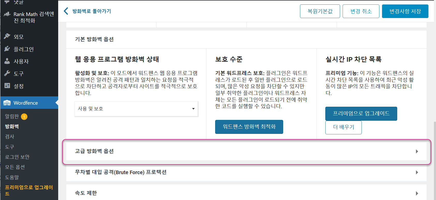수동으로 방화벽 규칙을 업데이트하려면 워드프레스 관리자 페이지 » Wordfence » 방화벽 » 고급 방화벽 옵션을 클릭합니다.