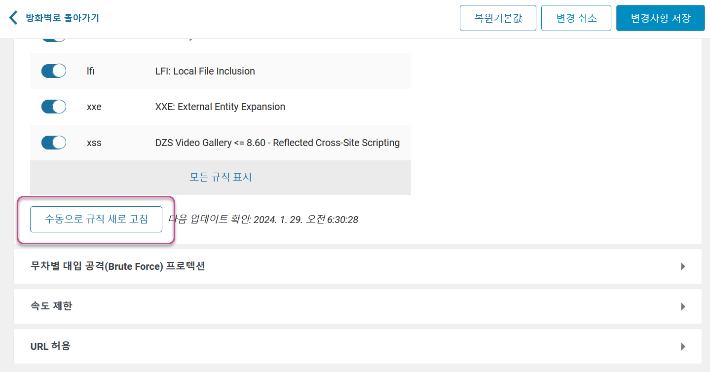 워드펜스 웹 응용 프로그램 방화벽에 대한 마지막 규칙 업데이트에 실패했습니다