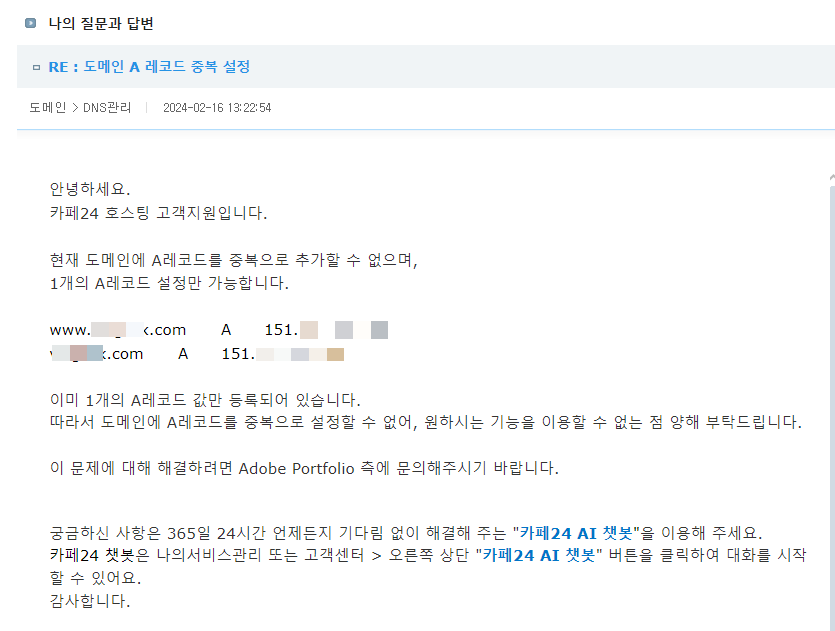 Adobe Portfolio 사이트에 도메인을 연결하는 방법과 카페24에서 동일 호스트에 대하여 중복으로 A 레코드를 설정하는 것이 불가능한 것에 대하여 살펴보겠습니다.