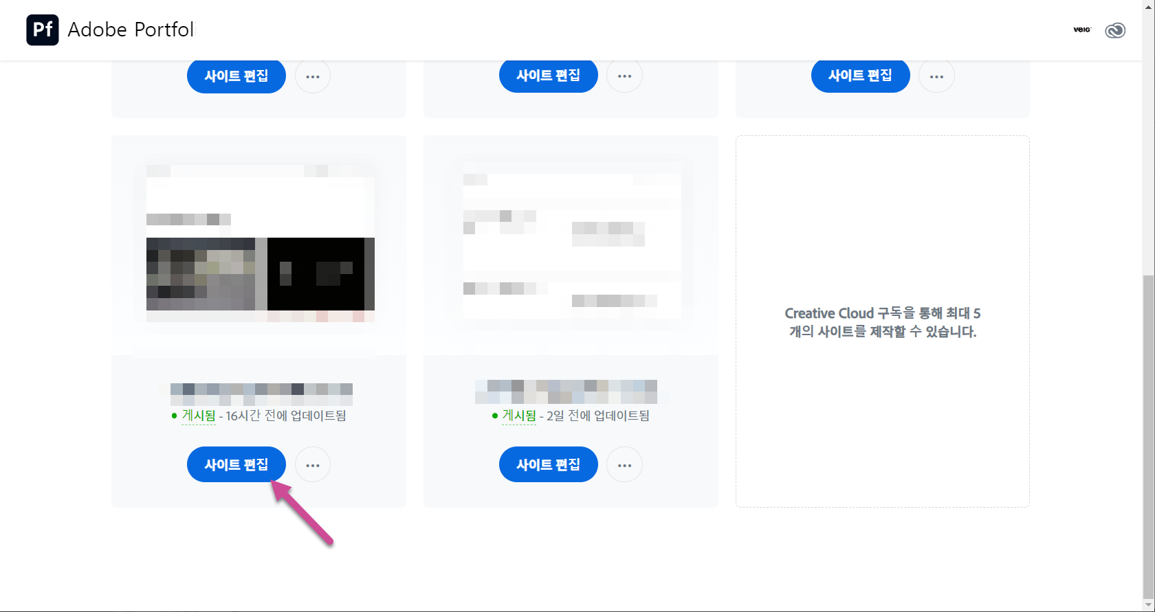 Adobe Portfolio에서 만든 포트폴리오 사이트에 도메인을 연결하려면 어도비 포트폴리오에 로그인한 다음, 해당 사이트의 사이트 편집 버튼을 클릭합니다.