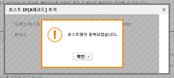 카페24에서 @과 www에 대하여 첫 번째 IP 주소를 지정한 다음, 두 번째 IP 주소를 동일한 호스트에 추가하려고 시도하면 다음과 같이 "호스트명이 중복되었습니다" 오류가 발생합니다.