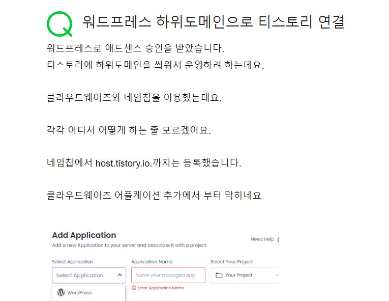 네이버 지식인에 티스토리에 워드프레스 하위 도메인을 연결하는 방법에 대한 질문이 올라와서 화면을 캡처해 보았습니다.