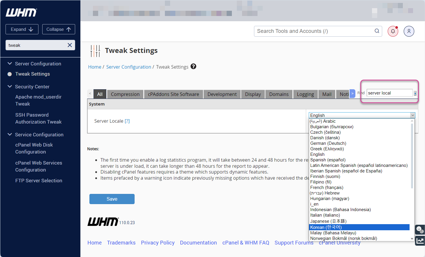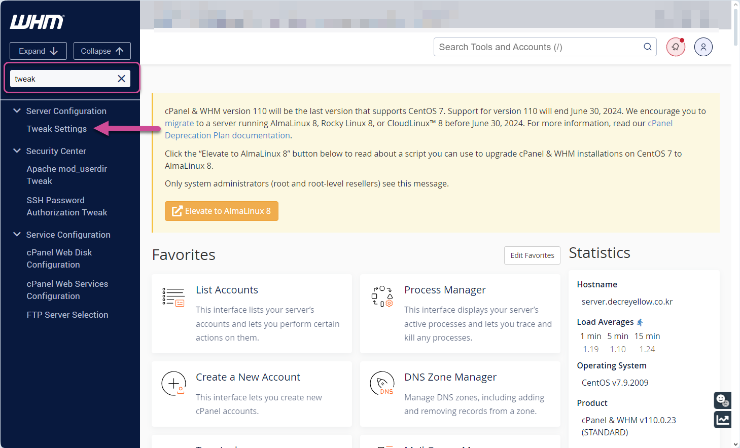 WHM 언어를 변경하려면 WHM에 로그인한 다음, Tweak Settings(설정 조정)를 선택합니다.