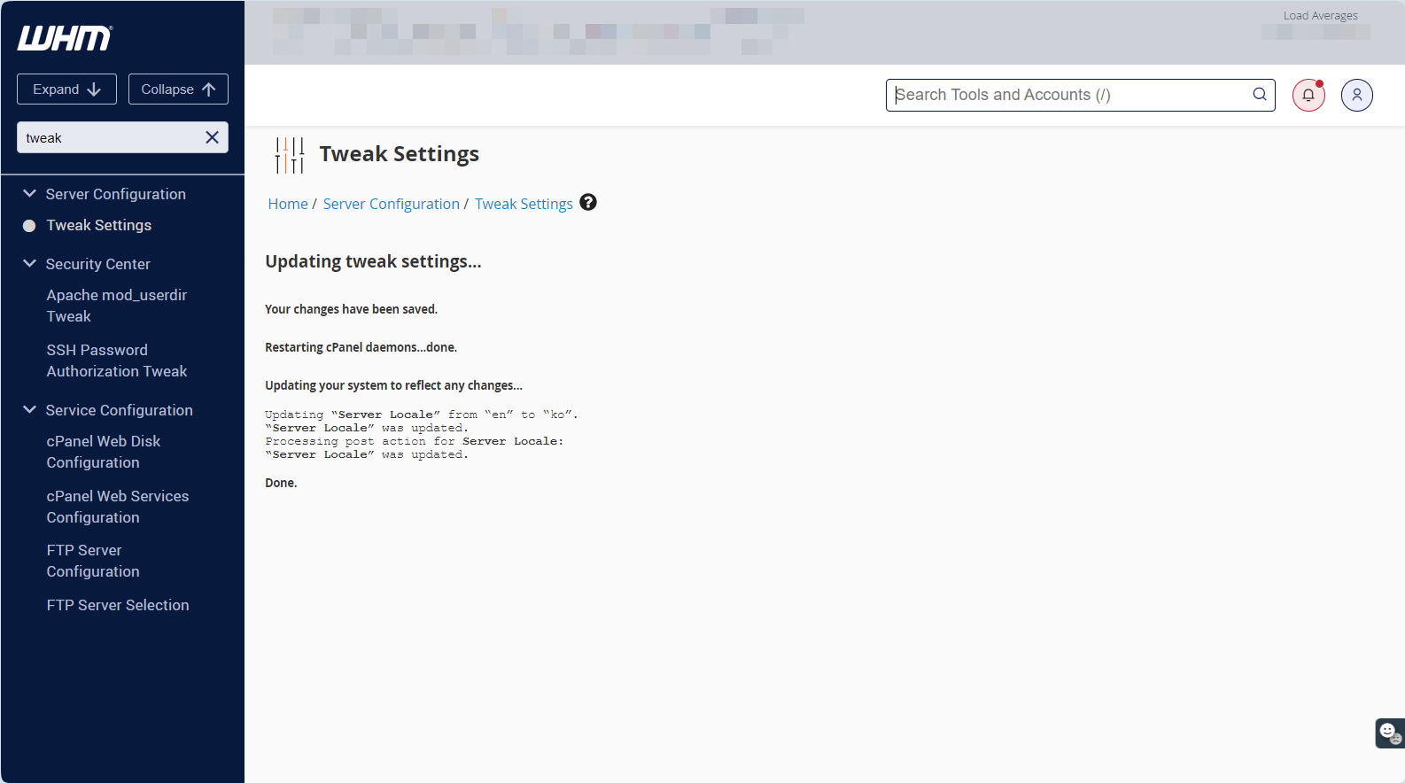 언어 변경이 완료되면 위와 같은 화면이 표시됩니다. WHM 사이트를 다시 로드하면 설정한 언어로 UI가 변경됩니다.