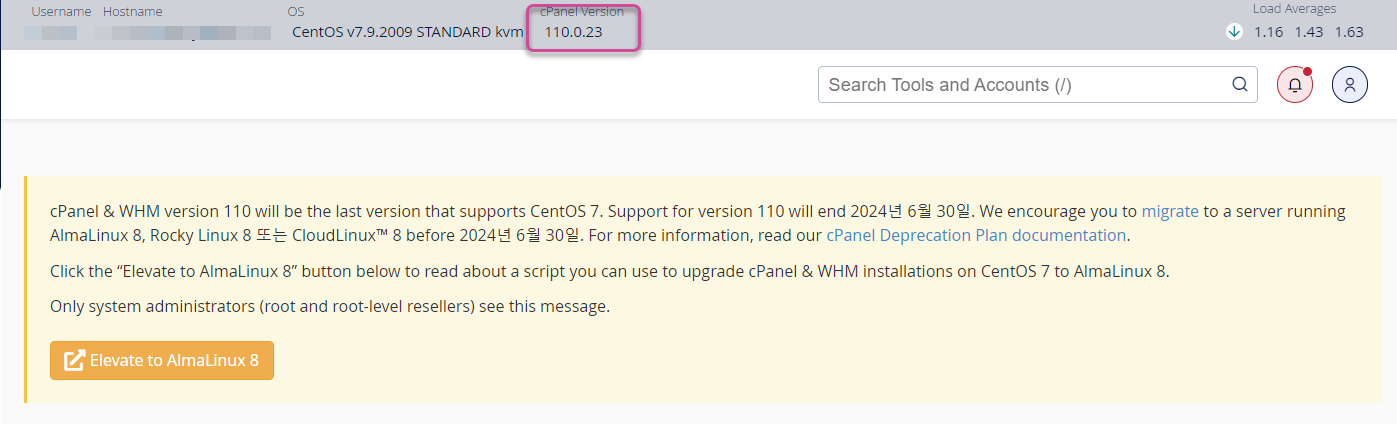 WHM 버전의 경우 110이 CentOS 7을 지원하는 마지막 버전이라고 안내되어 있습니다. 버전 110에 대한 지원은 2024년 6월 30일에 종료된다고 합니다. WHM 110에 대한 지원이 종료되면 어떻게 할 것인지 궁금하네요.