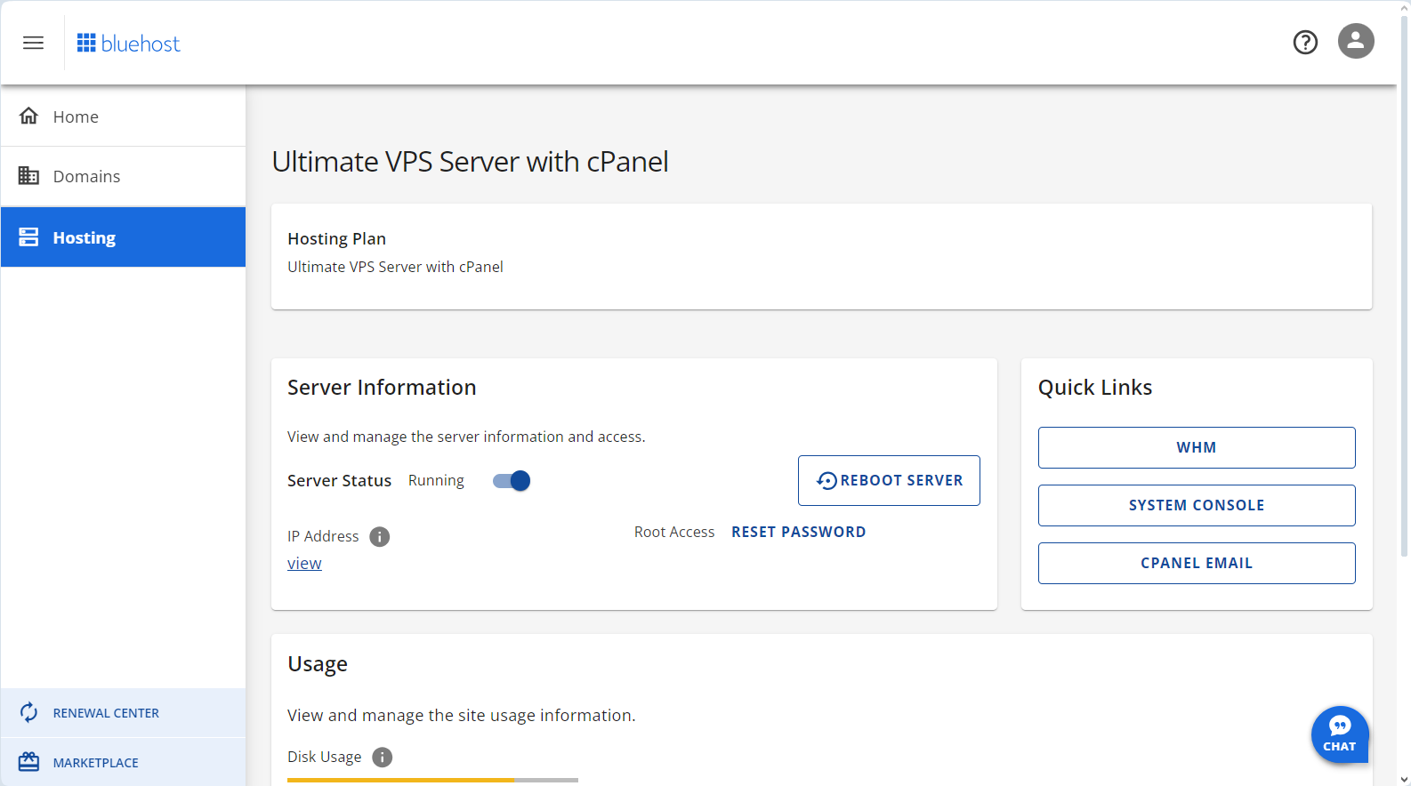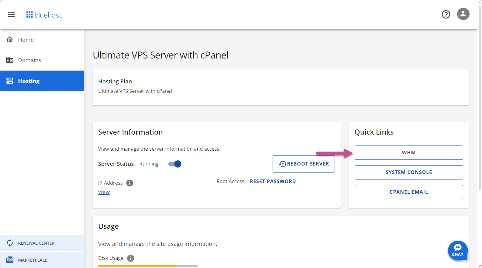 Bluehost VPS를 사용하는 경우 WHM에 접속이 가능합니다. 블루호스트는 작년에 계정 관리자의 인터페이스를 크게 변경했습니다. 이 때문에 Bluehost VPS 사용자들은 이전보다 사용하기가 더 불편해졌습니다. 이전에는 cPanel에 곧바로 접속이 가능했지만, 이제 Hosting 페이지에 이동해도 cPanel 접속 메뉴가 표시되지 않습니다.