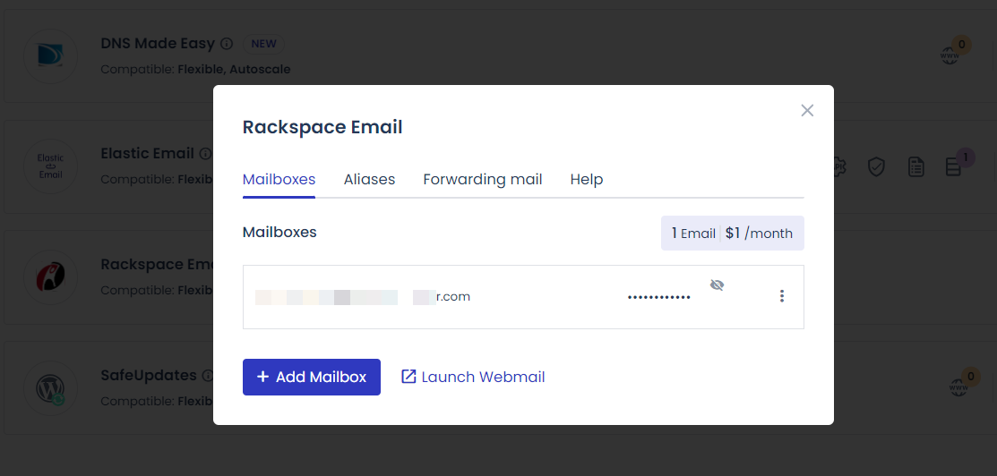 워드프레스 사이트 등에 연결된 도메인으로 된 이메일 계정이 필요한 경우에는 Rackspace Email 애드온 기능을 사용할 수 있습니다.