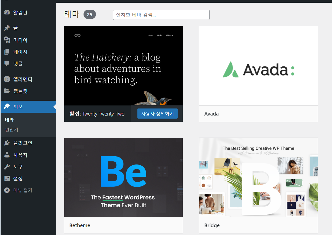 외모 » 테마에서 현재 활성화된 테마를 확인하고, 다른 테마를 설치하거나 다른 테마로 변경할 수 있습니다.