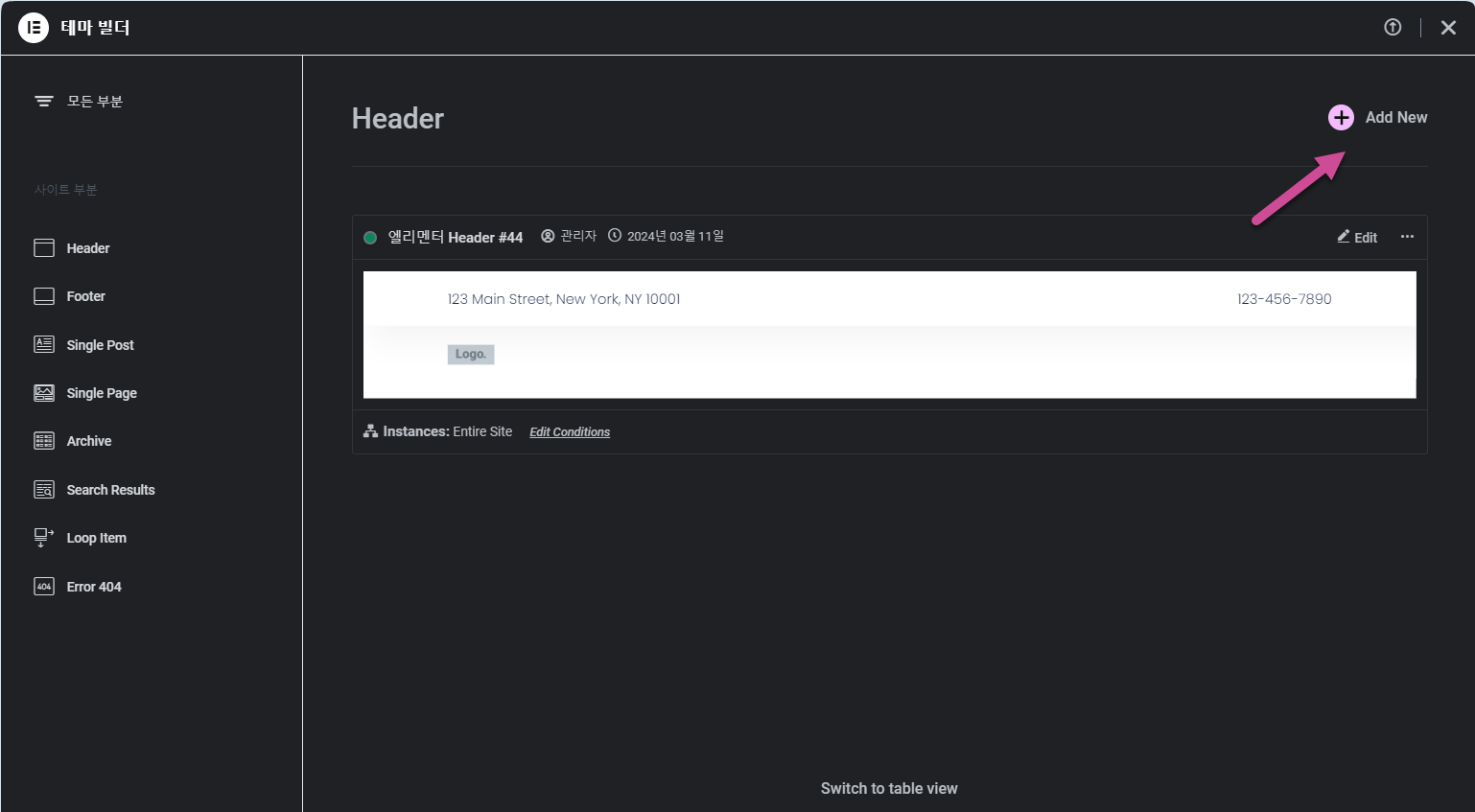 참고로 헤더 템플릿을 만들거나 라이브러리에서 헤더 템플릿을 로그하면 아래 그림과 같이 페이지 제목(예: 엘리멘터 Header #44)과 Content Area 문구가 표시될 것입니다.