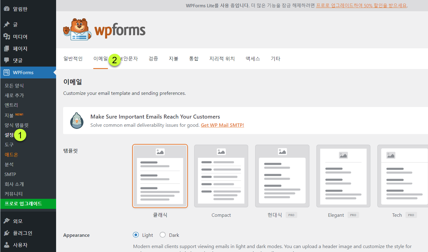 워드프레스 관리자 페이지 » WPForms » 설정 (Settings) » 이메일 탭으로 이동합니다.