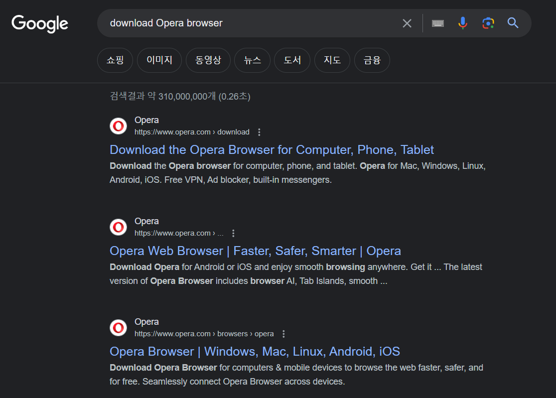 오페라 브라우저는 구글에서 "download opera broswer"로 검색하여 오페라 공홈에서 다운로드하여 설치할 수 있습니다.