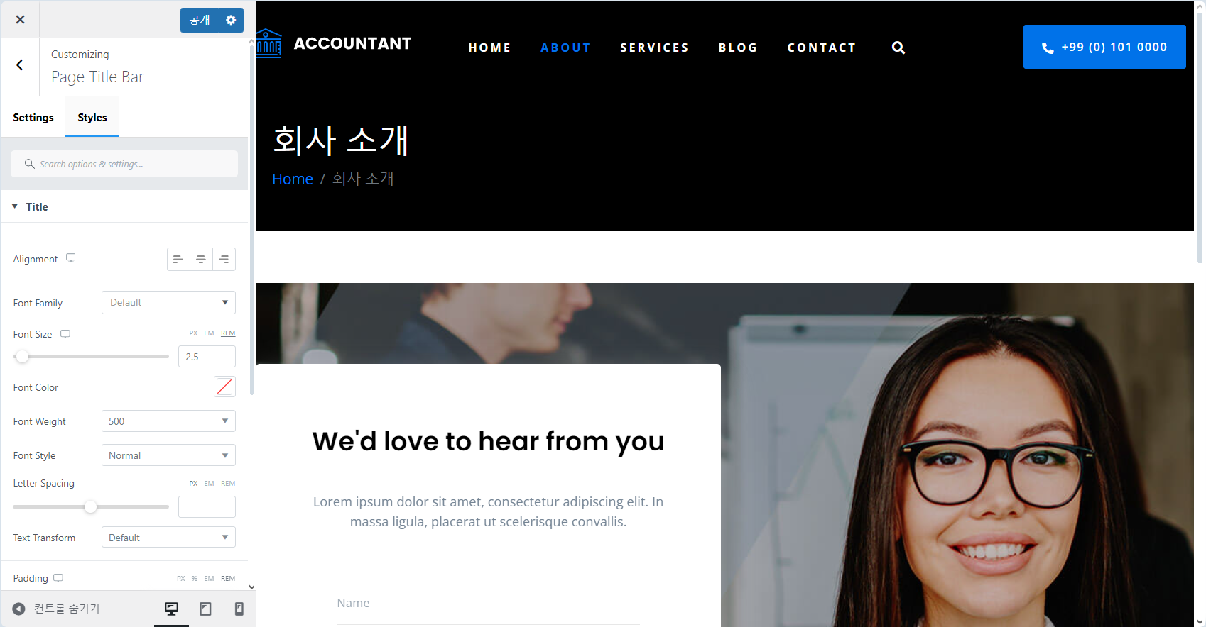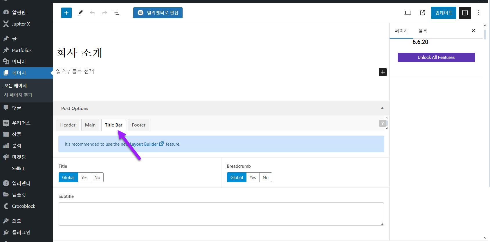 워드프레스 JupiterX 테마 페이지 타이틀 표시줄 설정