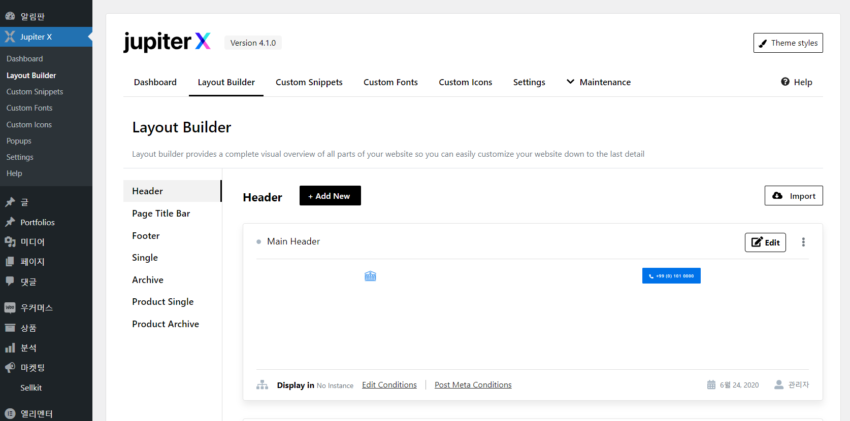 레이아웃 빌더는 엘리멘터 프로나 Divi 테마의 테마 빌더와 비슷한 기능입니다. 헤더, 페이지 타이틀 바, 푸터, 싱글(포스트), 아카이브(카테고리, 태그 페이지 등), 상품 페이지, 상품 아카이브 등의 레이아웃을 레이아웃 빌더로 만들 수 있습니다.