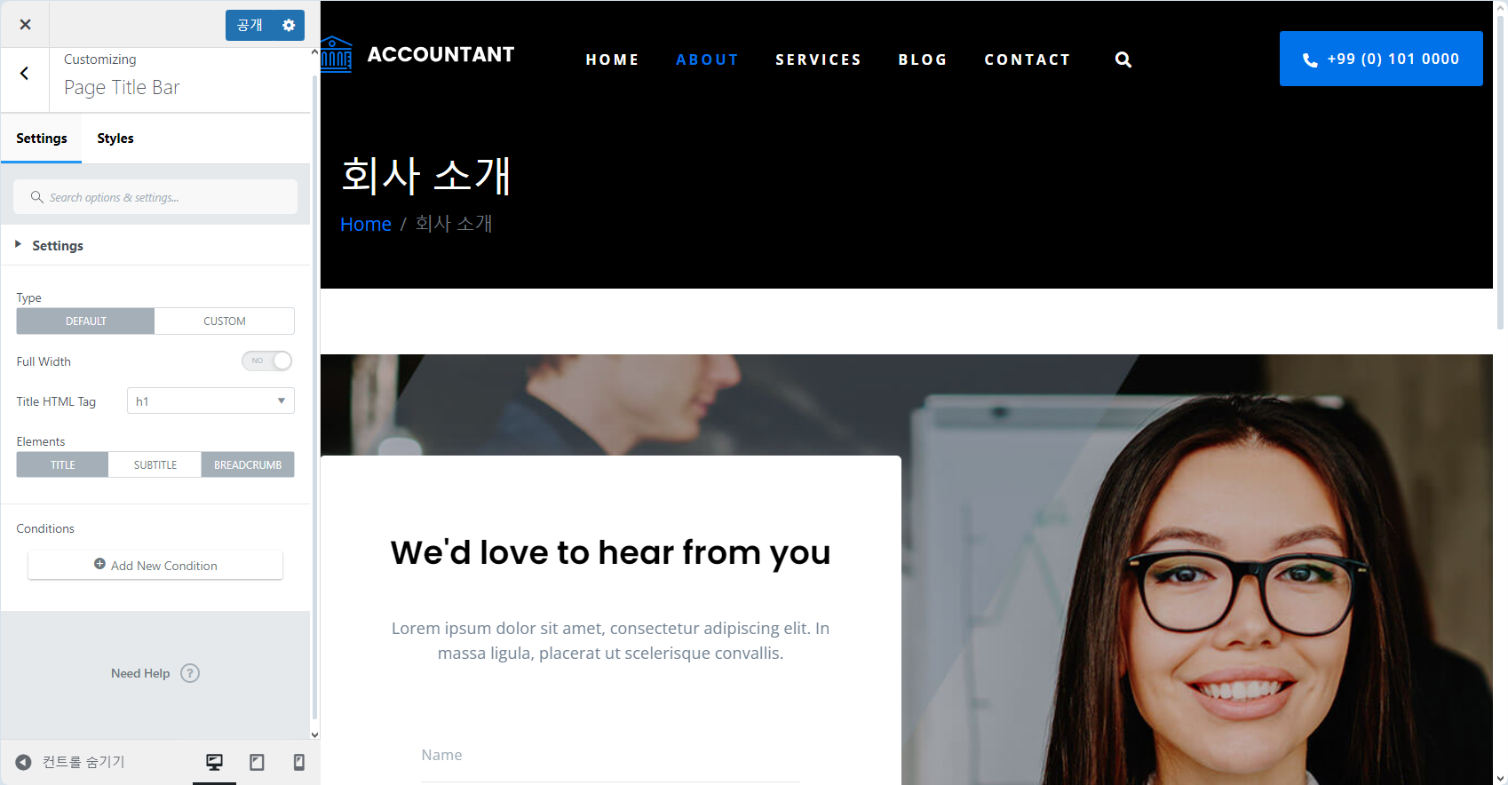 사용자 정의하기 설정과 다르게 페이지 타이틀 바를 설정하고 싶은 경우 페이지 편집 화면의 Post Options » Title Bar 탭에서 타이틀, 브레드크럼의 표시 여부를 설정할 수 있고, Subtitle을 입력할 수 있습니다.