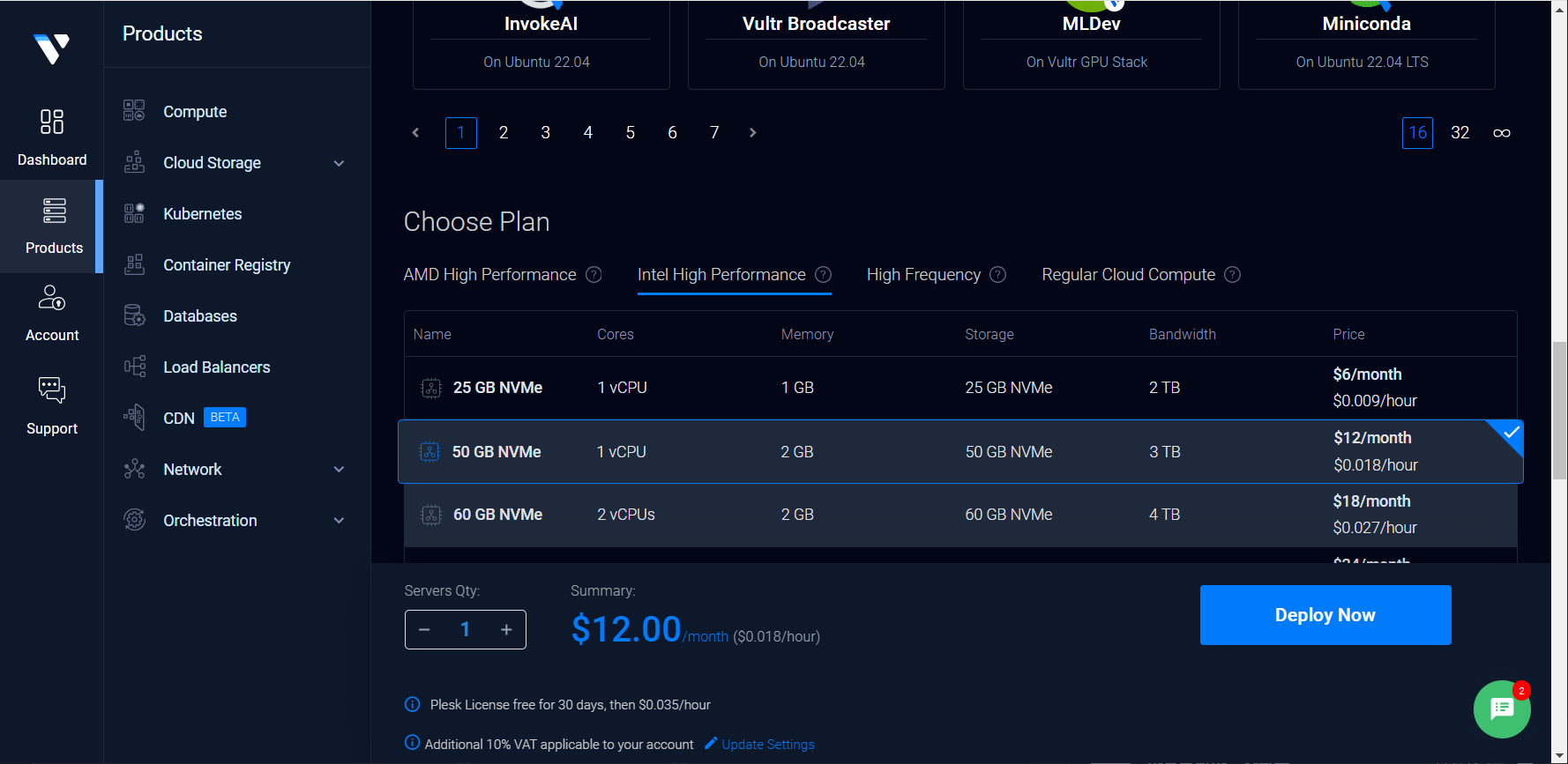 [참고*Vultr에서 Plesk 무료 버전이 제거되었습니다. 이제 Web Pro 또는 Web Host 중에서 선택할 수 있습니다.*]
