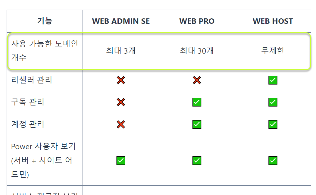 Web Admin SE는 최대 3개 도메인까지 지원되고, Web Pro는 최대 30개, Web Host는 도메인 개수 제한이 없습니다.