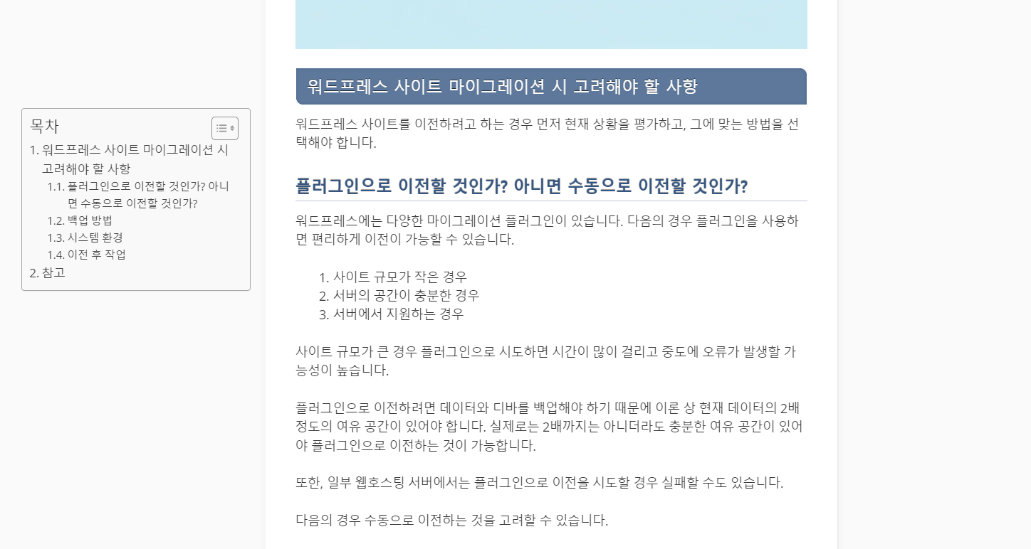 워드프레스에서는 무료 또는 유료 목차 플러그인을 사용하여 목차를 표시할 수 있습니다. 뉴스, 블로그 사이트에 많이 사용되는 뉴스페이퍼 테마에서는 자체적으로 목차 기능을 제공합니다. 싱