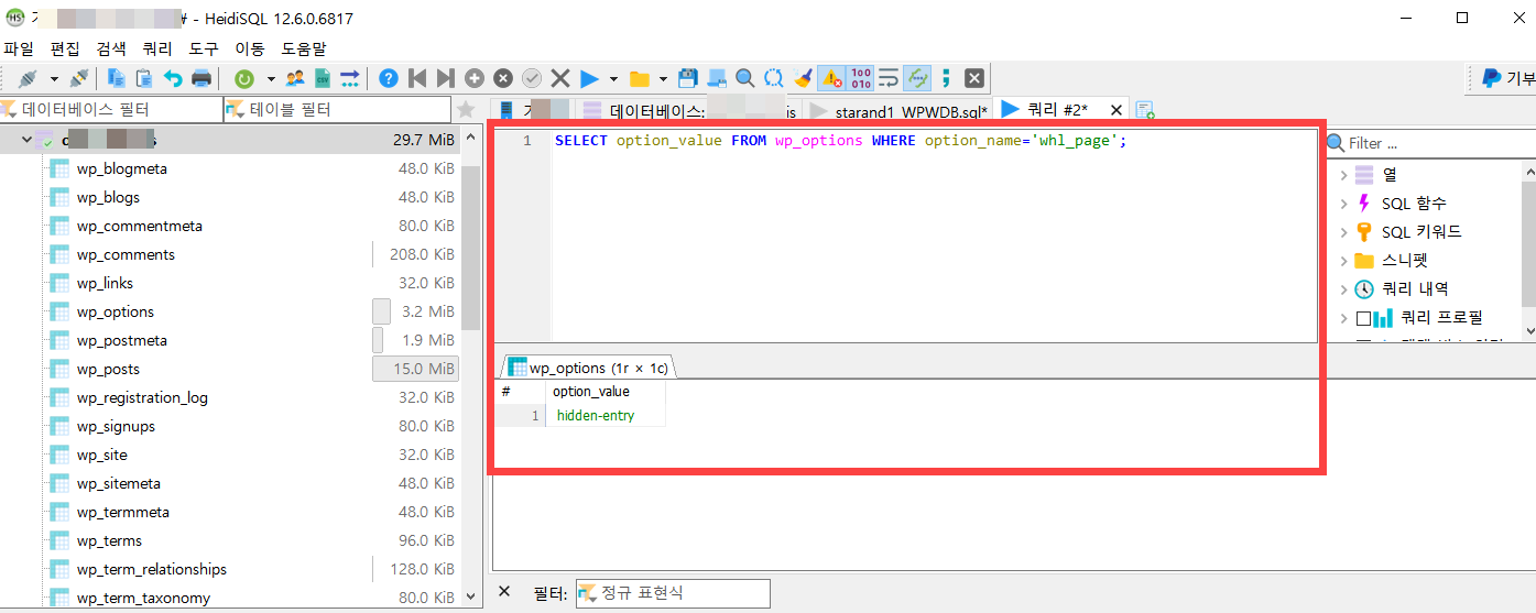 phpMyAdmin이나 HeidiSQL 등을 통해 데이터베이스(DB)에 접속하여 다음과 같은 SQL 쿼리를 실행하여 쉽게 변경된 로그인 URL을 체크할 수 있습니다.