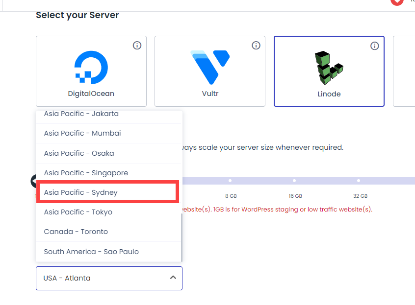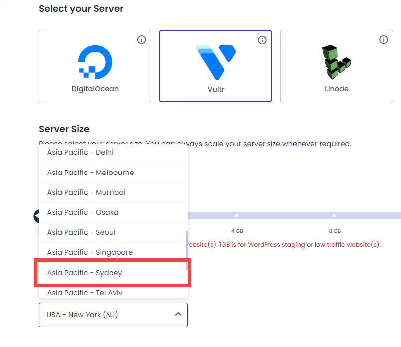예를 들어, Vultr를 사용하는 경우 호주의 멜버른과 시드니 서버 리전을 선택할 수 있습니다.
