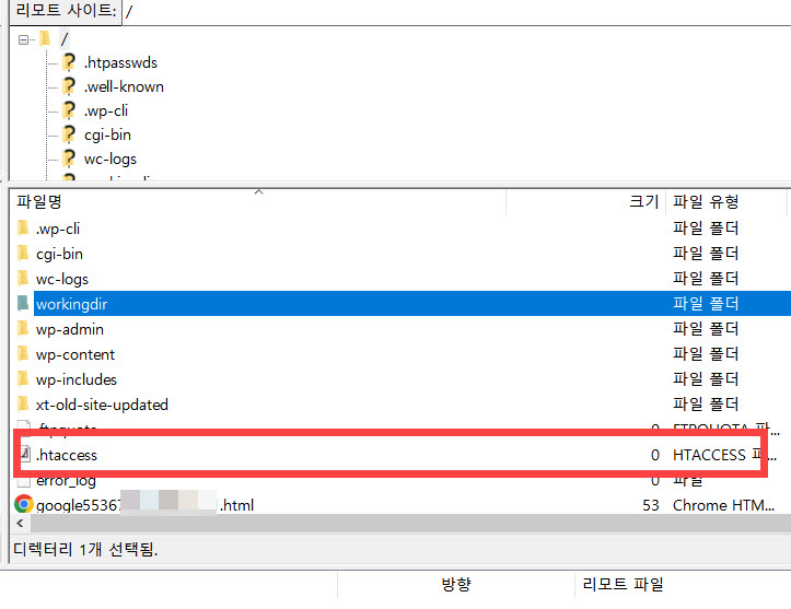 404 오류가 발생하는 원인 중 하나는 .htaccess 파일에 문제가 있는 경우입니다. 실제로 해당 사이트의 .htaccess 파일을 체크해 보니 크기가 0으로 되어 있었습니다.