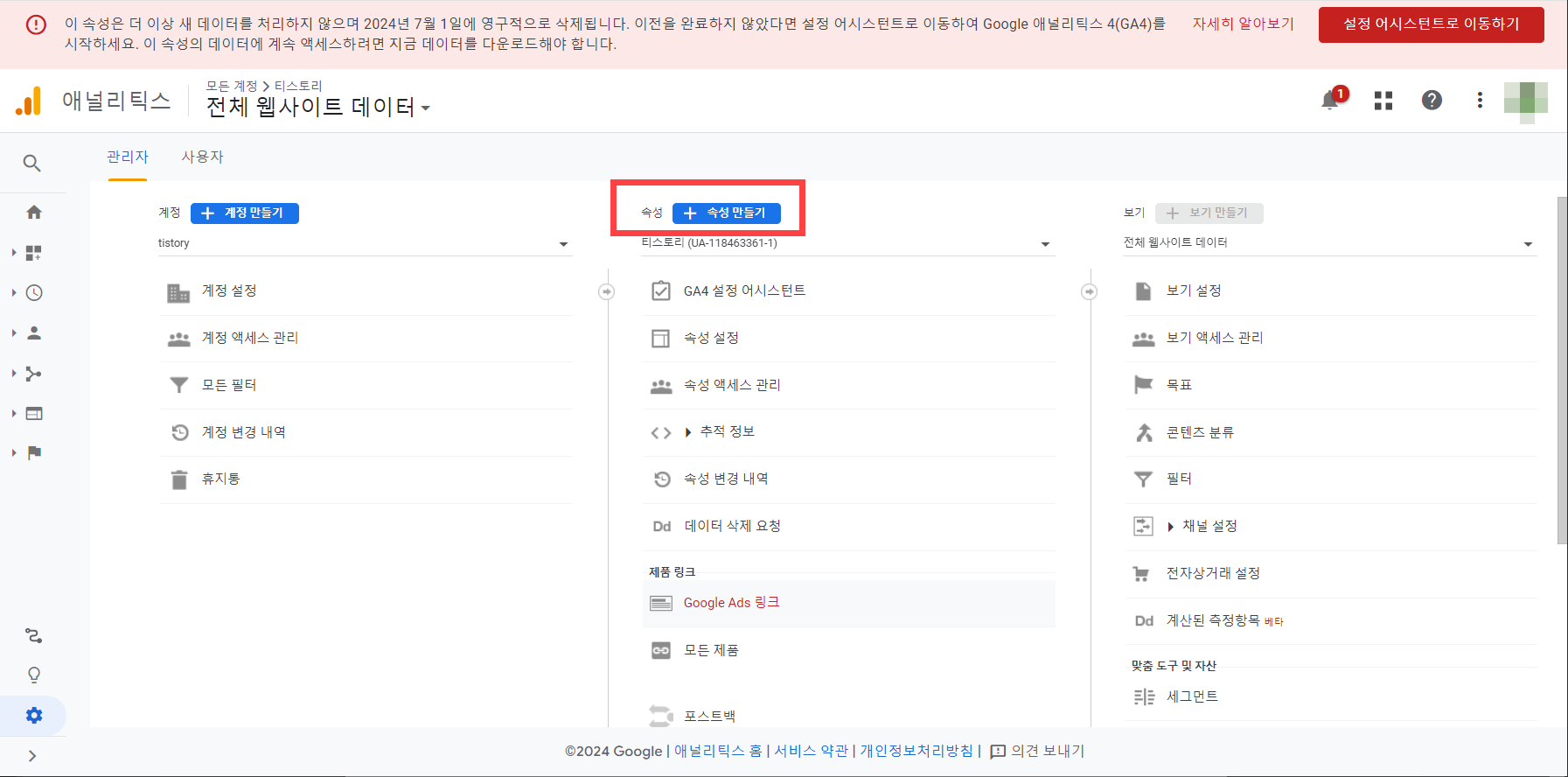 기존 UA 속성을 사용하고 있다면 상단에 "이 속성은 더 이상 새 데이터를 처리하지 않으며 2024년 7월 1일부터 영구적으로 삭제됩니다. 이전을 완료하지 않았다면 설정 어시스턴트로 이동하여 Google 애널리틱스 4(GA4)를 시작하세요. 이 속성의 데이터에 계속 액세스하려면 지금 데이터를 다운로드해야 합니다." 경고가 표시됩니다.