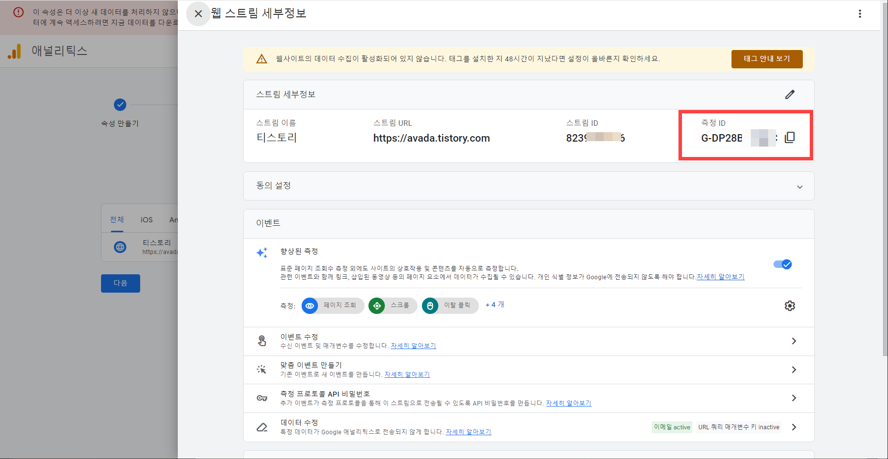 [참고*이미 GA4 속성을 추가하고 추적 코드를 스킨 파일에 입력했지만 데이터가 수집되지 않는 경우, 기존 코드를 삭제하고 아래의 "GA4 속성 만들기 및 설정 완료하기" 이하 부분을 참고하여 새로 속성을 만들어서 추적 코드를 다시 입력해 보시기 바랍니다.*]