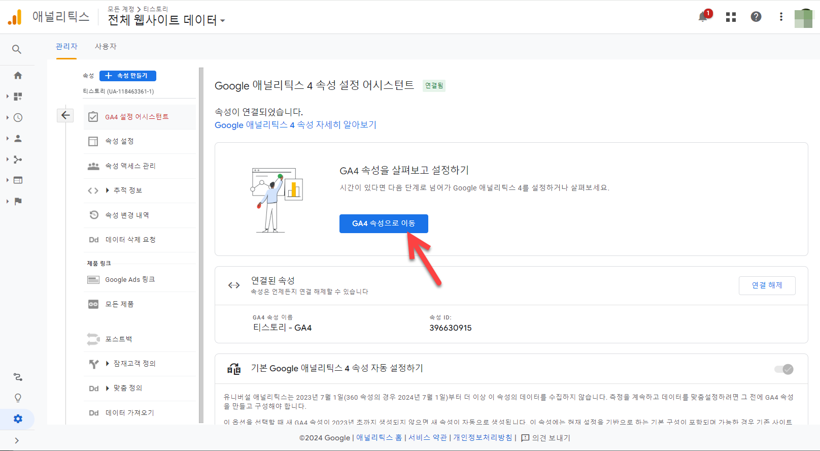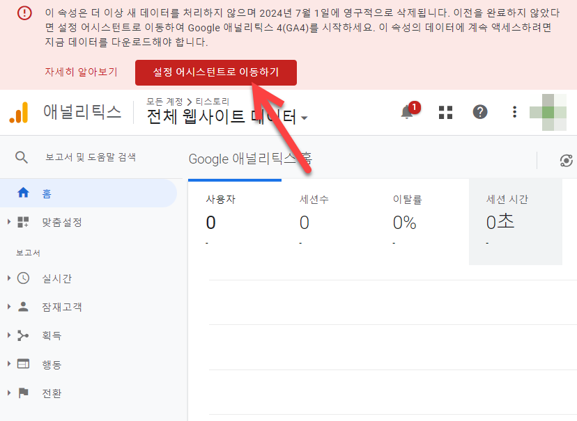 UA 속성을 사용하고 있고 위과 같은 경고가 표시되면 설정 어시스턴트로 이동하기를 클릭하여 GA4로 전환할 수 있습니다.